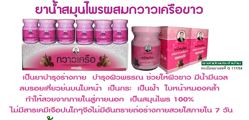 เป็นยาบำรุงร่างกายบำรุงผิวพรรณ ช่วยให้หน้าอกใหญ่และเต่งตึง ช่วยให้ผิวขาว ลบรอยเหี่ยวย่นบนใบหน้า เป็นกระ เป็นฝ้า ใบหน้าหมองคล้ำ หรือใบหน้ามัน ใบหน้าแห้งเกินไป ทาแป้งไม่ติด กวาวเครือขาวเป็นยาที่ทำให้สวยจากภายในสู่ภายนอก บางท่านทานยากวาวเครือขาว แล้วมีอาการหน้าลอกสิวขึ้นเล็กน้อยอย่าตกใจ เพราะเซลล์ผิวที่เสียหรือตายแล้วจะลอกออกมาก่อน แล้วสร้างเซลล์ผิวหน้าใหม่ จะทำให้ผิวที่ฟื้นคืนขึ้นมาใหม่มีความแข็งแรง คงทนต่อสภาวะแวดล้อม แสงแดด ลม หรือความร้อน สมุนไพรกวาวเครือขาวเป็นสมุนไพรที่ไม่มีสารเคมี ไม่ว่าจะเป็นกลูต้าไธโอน ไม่มีไวท์เทนนิ่ง ไม่มี AHA หรือสารคอลลาเจน กวาวเครือขาวเป็นสมุนไพรธรรมชาติ 100% ไม่มีอันตรายต่อสุขภาพของท่าน